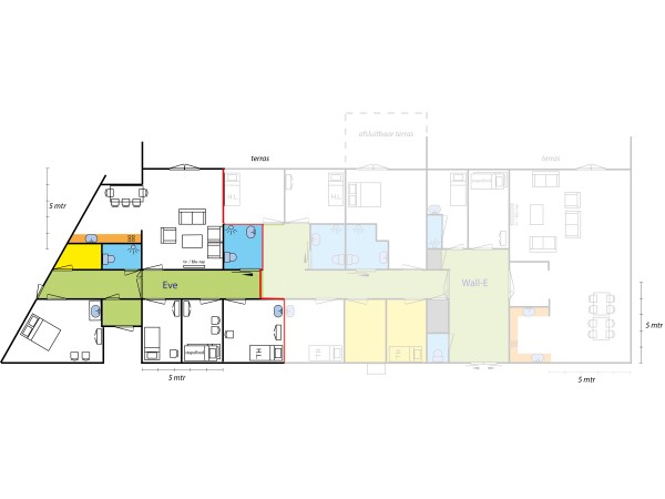In de eethoek staat een eettafel voor zes personen. De zithoek bestaat uit twee tweezitsbanken en een grote vormvaste zitzak. Er is een televisie, Blu-ray speler en een hifi-set met cd-speler. Iedere bungalow heeft een Wii-spelcomputer; de spellen en de controllers zijn gratis te leen in het Meeting Point. Openslaande deuren naar een eigen terras.