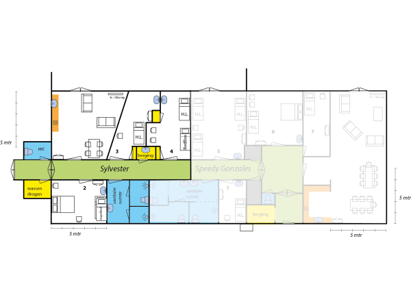 Die gemütlichen Ferienbungalows Lady Marian, Bugs Bunny, Tinkelbel und Eve bieten Platz für sechs Personen. Die Bungalows (außer Eve) können auch mit einem Bungalow für acht Personen verbunden werden. Dann können dort vierzehn Personen wohnen und man hat zwei komplett ausgestattete Küchen und zwei Wohnzimmer zur Verfügung. Das ist ideal für einen Urlaub mit einer größeren Familie oder Gruppe. Der Ferienbungalow Eve hat eine abweichende Aufteilung und ist mit seiner gemütlichen Einrichtung für eine Gruppe von sechs Personen mit maximal einem Rollstuhlfahrer geeignet. Alle Bungalows verfügen über eine Waschmaschine und einen Wäschetrockner.