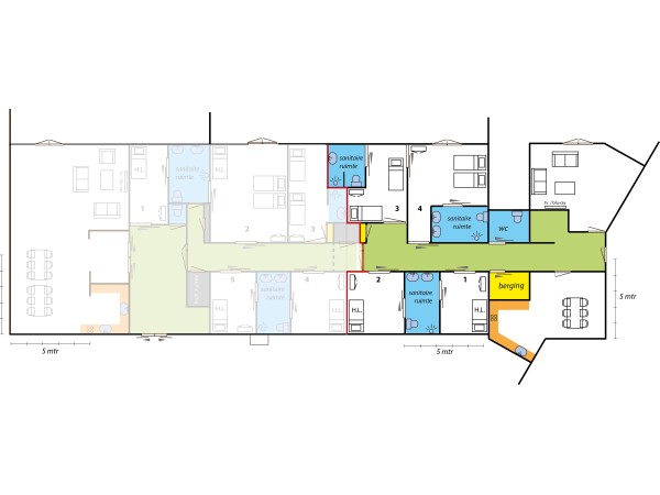 Drie slaapkamers met in totaal: een tweepersoonsbed, een stapelbed, een éénpersoonsbed, een omsloten bedbox en een hoog-laag bed met een Visco med decubitus preventie matras. De bedden zijn opgemaakt bij aankomst. Handdoekensets en extra bedlinnenpakketten kun je bij ons huren.