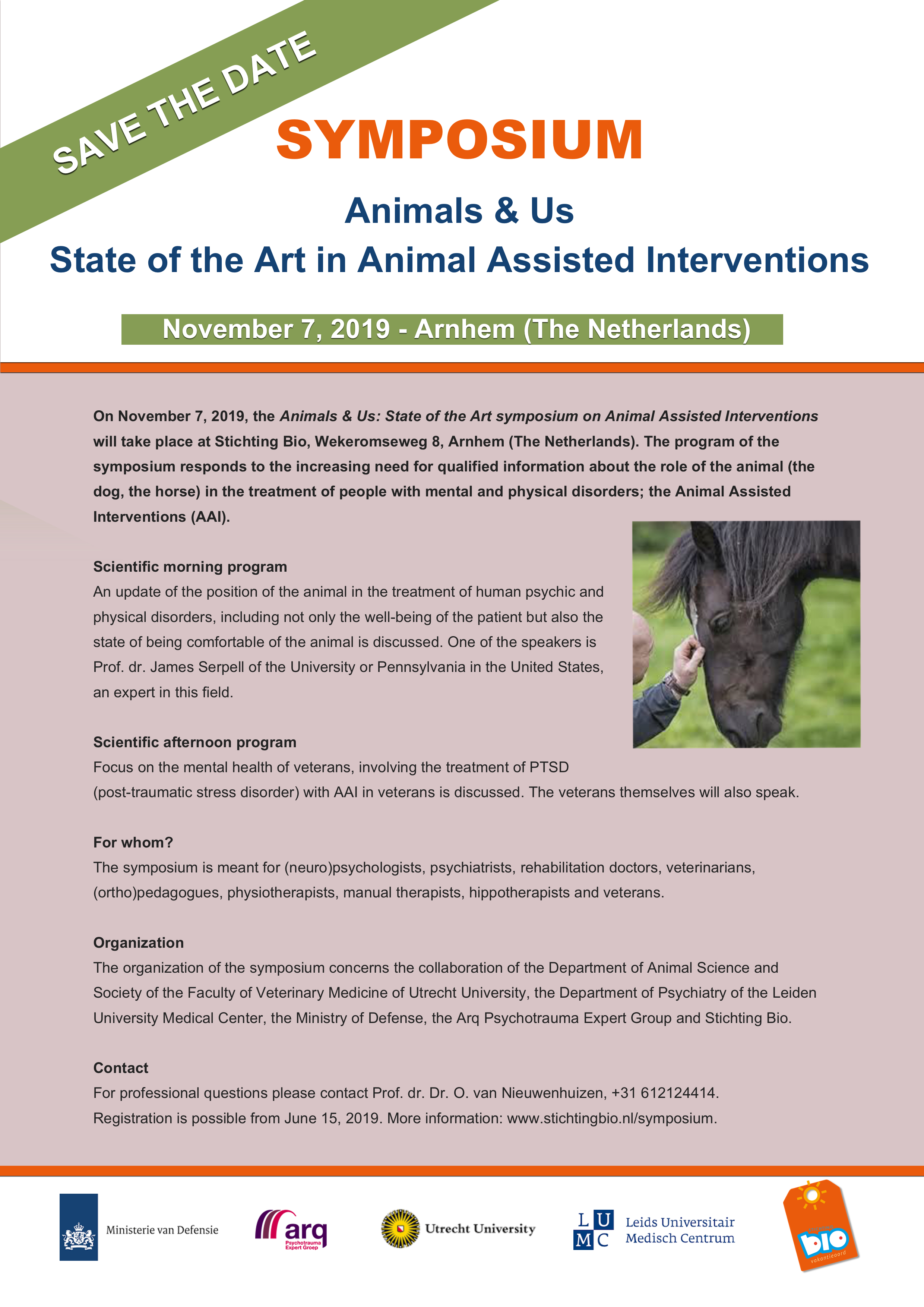 De organisatie van het symposium betreft de samenwerking van het Departement Dier in Wetenschap en Maatschappij van de Faculteit Diergeneeskunde van de Universiteit Utrecht, de afdeling Psychiatrie van het Leids Universitair Medisch Centrum, het Ministerie van Defensie, de Arq Psychotrauma Expert Groep en Stichting Bio.