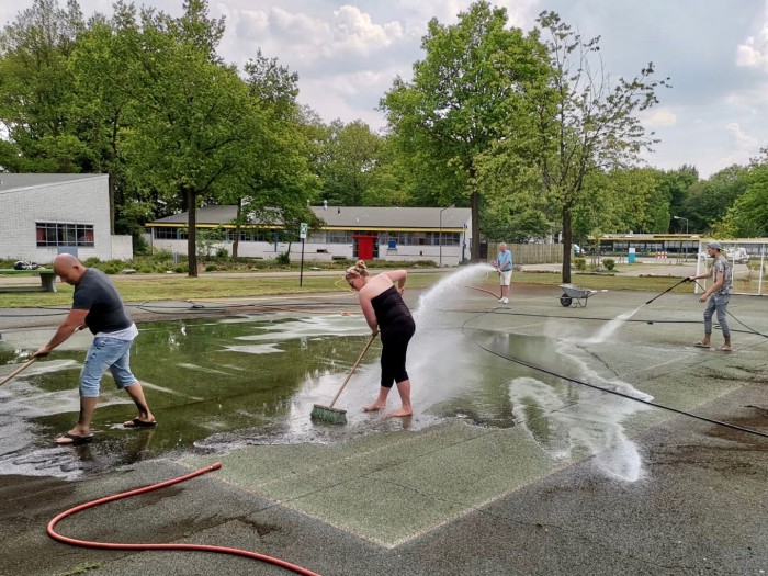 Ruim twintig medewerkers van Pharos Reizen maakten hun borst nat bij Bio. Letterlijk en figuurlijk. Want water was wel het grote thema van hun klusdag! Blootsvoets en niet bang voor een spatje, namen zij spuiten en hogedrukreinigers ter hand en gaven het sportplein achter het zwembad een intensieve schoonmaakbeurt. En het resultaat was oogverblindend!
