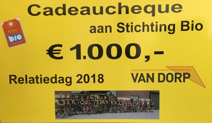 De jaarlijkse Van Dorp Zevenaar Relatiedag stond in het teken van racefietsen of mountainbiken met afstanden van 60 tot 112 km. Martin Maatkamp en Robby de Reus van Van Dorp overhandigden tijdens deze dag aan Frans Wientjes een cheque ter waarde van maar liefst € 1.000.